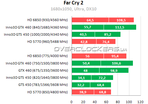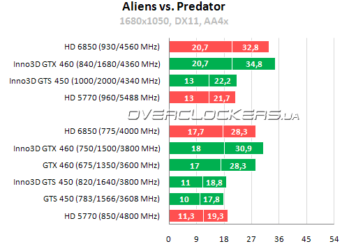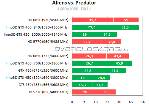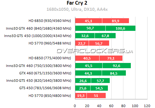 В простом режиме Radeon HD 6850 по минимальному fps обходит как обычный GeForce GTX 460, так и карту iChill. Зато в более тяжелом режиме при включении сглаживания вперед выходят решения NVIDIA. Преимущество iChill GTX 460 над референсом не более 10%, у iChill GTS 450 преимущество над собратом менее 6%.
