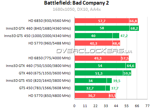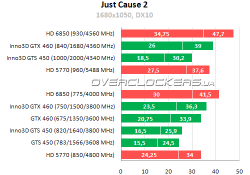 В этой игре мы не приводим результаты Radeon HD 6850, потому что на драйверах Catalyst 10.10 наблюдался неправильный рендеринг теней и источников освещения. В любом случае, производительности этой карты и любого GeForce GTX 460 хватит лишь для комфортной игры в DirectX 10, но не в DirectX 11.