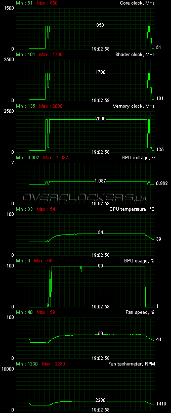 При 12-минутной нагрузке Crysis Warhead (демо Ambush на 1920х1200, Very High, DX10, AA8x) температура ядра не превысила 54 °С, а обдувающий вентилятор раскрутился до 59% (2280 об/мин).