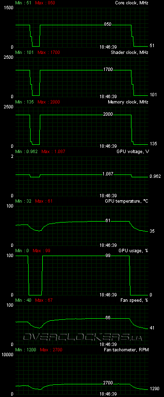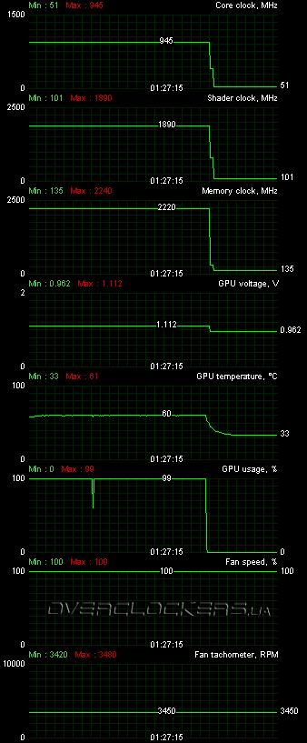 Разгоном данный видеоадаптер нас удивить не смог. Даже при максимальных оборотах вентилятора не удалось достигнуть заветной отметки в 1 ГГц. GPU был стабилен на частоте 945 МГц, не более.