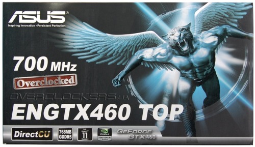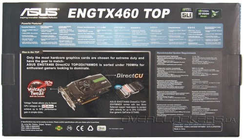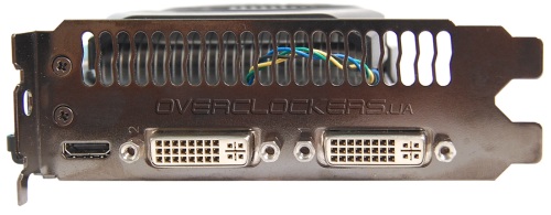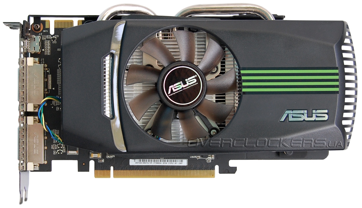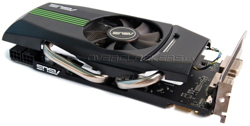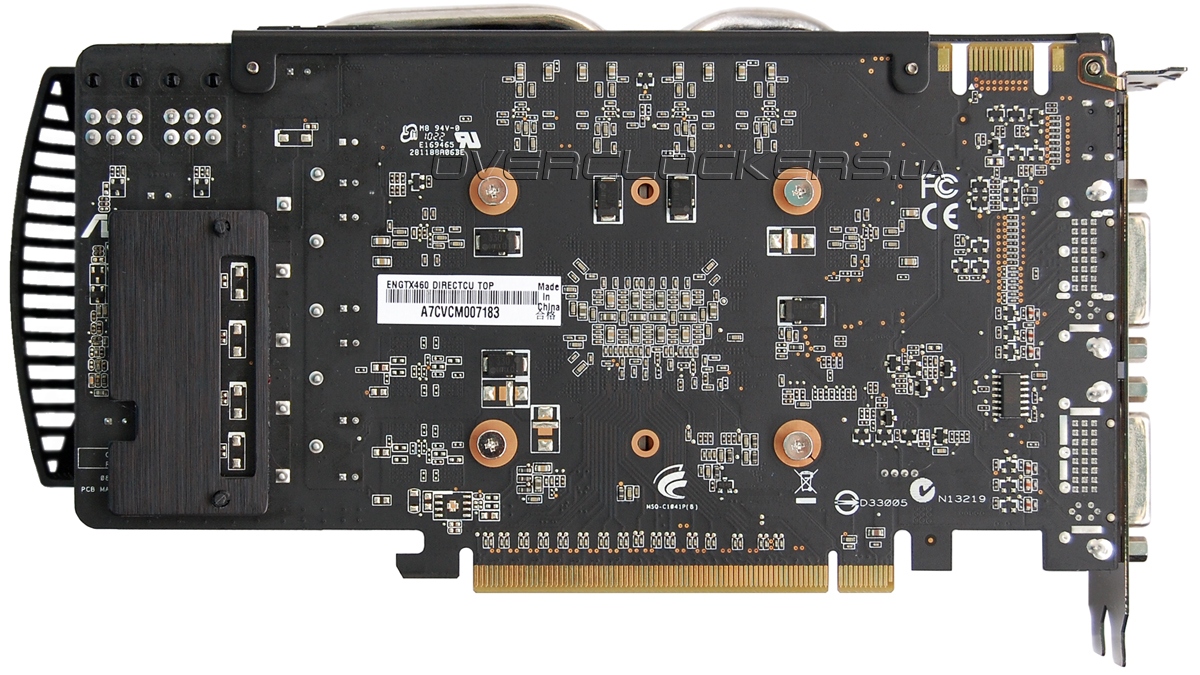Сбоку все так же прикручена планка с логотипом ASUS для придания жесткости конструкции. Как и положено GeForce GTX 460, карта оснащена двумя 6-контактными разъемами питания.