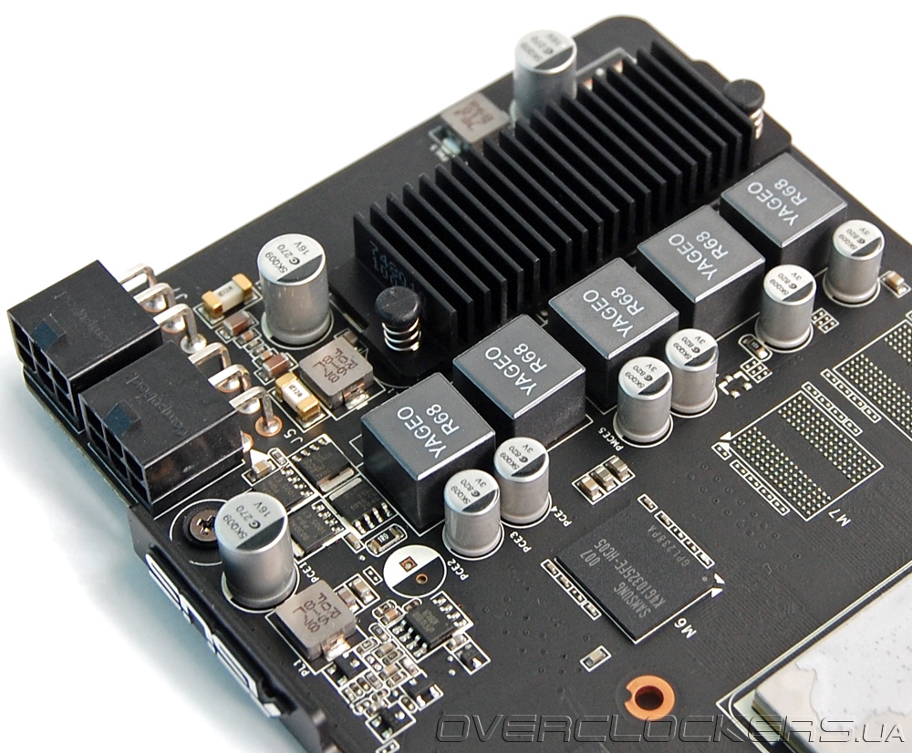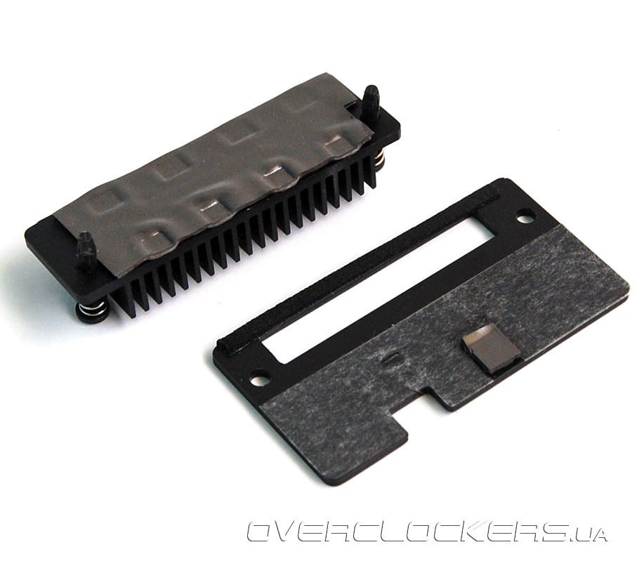 Для охлаждения «мосфетов» предусмотрен отдельный радиатор, который фиксируется защелками, с обратной стороны платы прижимающими и пластину-радиатор контроллера питания. Вот только если на прошлой карте под пластину были подложены небольшие шайбочки, поддерживающие ее в ровном положении, то у данной модели ничего подобного нет и пластина наклонена под углом к плоскости платы. Полноценный контакт поверхности микросхемы с поверхностью пластины в таких условиях обеспечивается за счет применения теплопроводящей «подушечки».