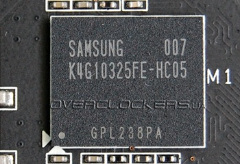 Объем памяти в 768 МБ набран шестью микросхемами Samsung K4G10325FE-HC05.