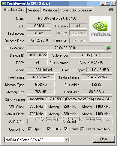 Это первое наше знакомство с 192-битной версией GeForce GTX 460. В отличие от полноценной 256-битной версии у данной модели в GPU отключен один контроллер памяти с соответствующими 8 блоками ROP. Объем кэш-памяти L2 — 384 КБ вместо 512 КБ у старшей версии. Стандартный объем видеопамяти — 768 мегабайт.