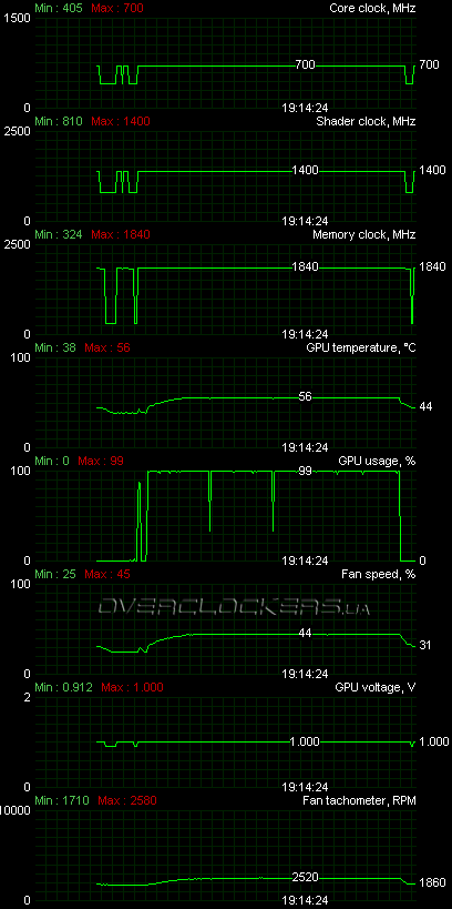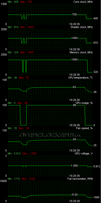 Обороты вентилятора пришлось поднимать: для прохождения FurMark до 70% от максимума, для стабильности в игровых тестах хватало 60% (3500 об/мин).