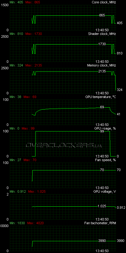 Разгонный потенциал у данной модели неплохой, но не выдающийся. Ядро смогло стабильно работать на 865/1730 МГц при минимальном поднятии напряжения (на 0,025 В), память стабильно функционировала на 4270 МГц.