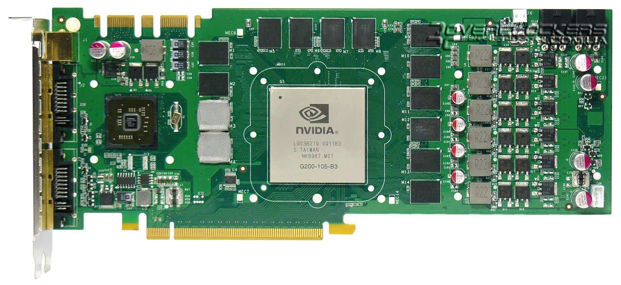 В качестве графического процессора используются чип G200-105 ревизии B3. Защитной рамки нет, хотя предусмотрено место для ее установки.