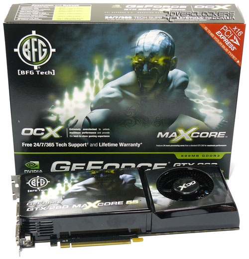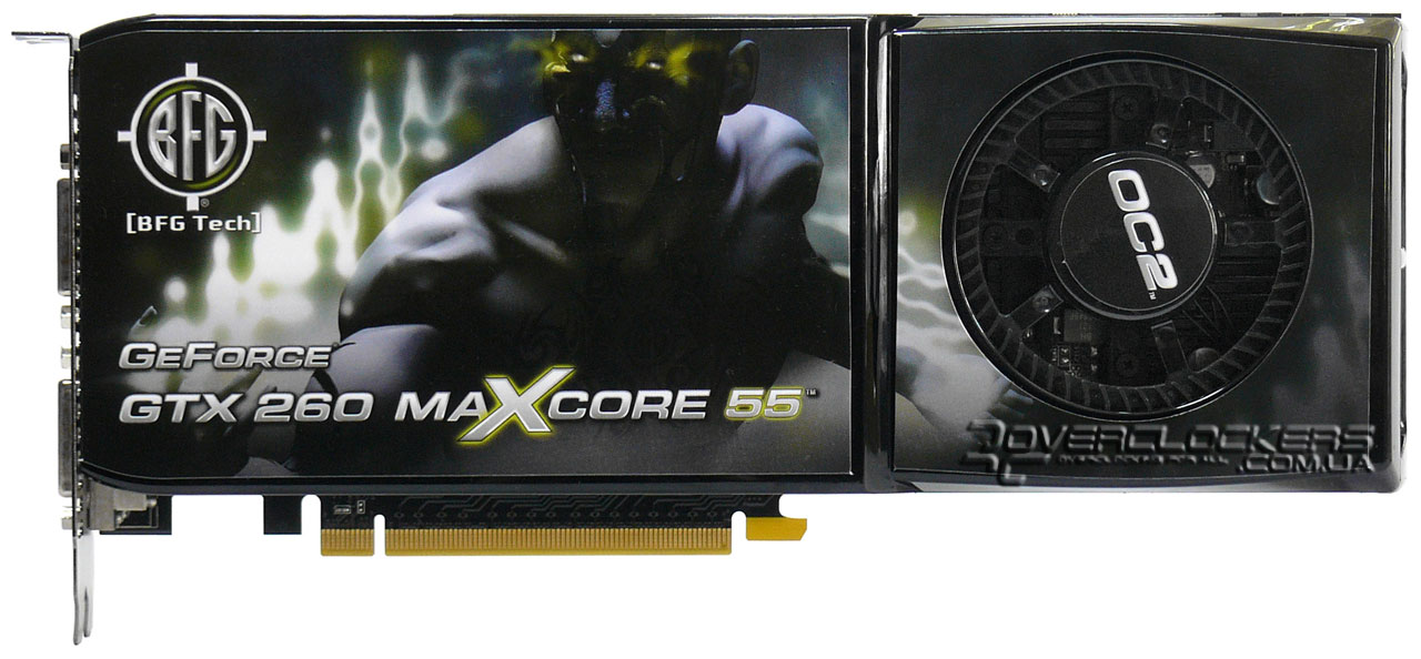 В качестве представителя младшей модели была взята карта BFG GeForce GTX 260 OC2. Адаптер поставляется в небольшой коробке с изображением все того же зататуированного «культуриста-фокусника», который встречался уже на упаковке рассмотренной недавно BFG GeForce GTX 285 OC, только оформление теперь выполнено в более прохладных тонах.