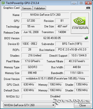 Графический процессор BFG GeForce GTX 260 OC2 работает на частоте 630/1350 МГц, память — на 2126 МГц. Напомним эталонные частоты, которые равны 576/1242 МГц для чипа и 1998 МГц для памяти. Переходы между режимами работы адаптера аналогичны переходам в Inno3D iChill GTX275 Accelero XXX.