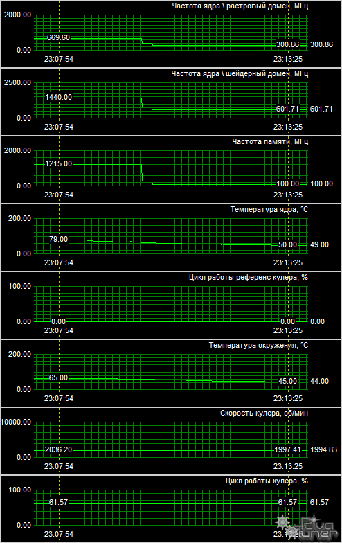 Разгон карты ограничился частотами 670/1440 МГц по чипу и 2430 МГц по памяти, при этом скорость вращения турбины принудительно была выставлена на 60%, иначе видеокарта попросту зависала при нагреве ядра свыше 80 °C.