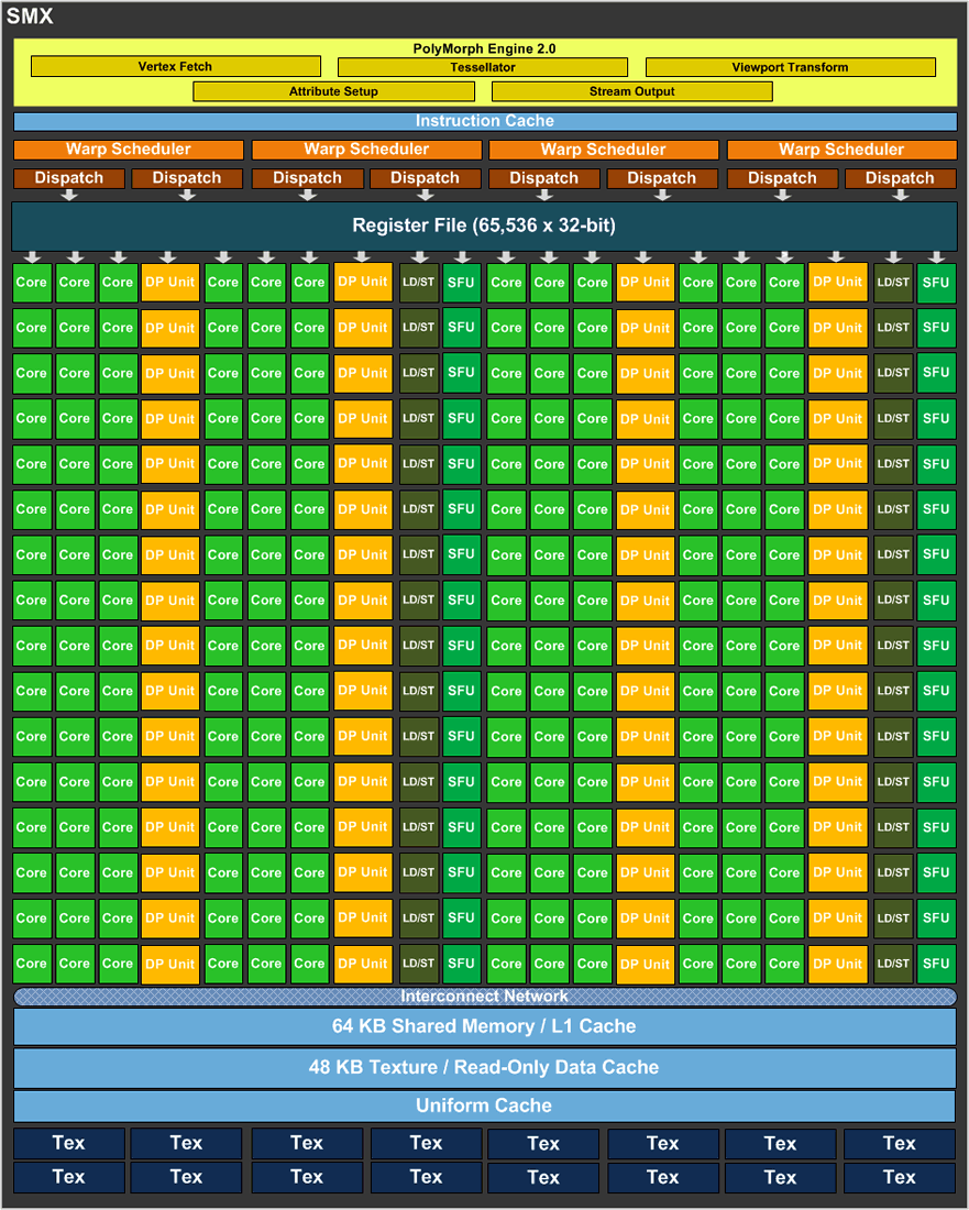 Структура блоков SMX мало чем отличается от привычных SMX у других GPU семейства Kepler. Каждый насчитывает 192 потоковых процессора и 16 текстурных блока. Главное преимущество над более простыми видеокартами NVIDIA у этих SMX — в большéм количестве специальных блоков (DP Unit) для выполнения вычислений двойной точности FP64. Их 64, в то время как у GK104 один SMX насчитывал всего лишь восемь таких юнитов. Так что в специализированных неграфических вычислениях преимущество Titan над GeForce GTX 680 должно быть колоссальным. Размеры блока текстурного кэша на нижней схеме наводят на мысли о некотором его увеличении, но официальных данных на этот счет у нас нет.