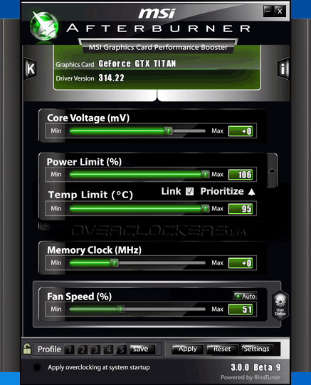 Кстати, итоговый разгон у нас оказался ниже указанных выше значений. Длительные нагрузки без сбоев Titan выдержал при базовой частоте ядра в 947 МГц и скромном разгоне памяти до 6840 МГц. Ползунки мощности и температуры были подняты до максимума.