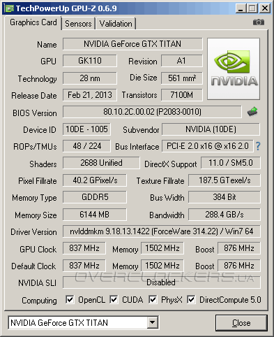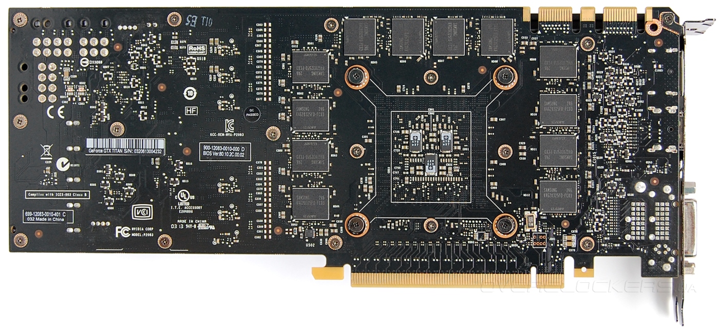 На данный момент NVIDIA запрещает партнерам эксперименты с дизайном PCB, поэтому все Titan выполнены по единому референсному дизайну. Плата длиной чуть менее 27 сантиметров. Узел питания сложнее чем у GeForce GTX 680.