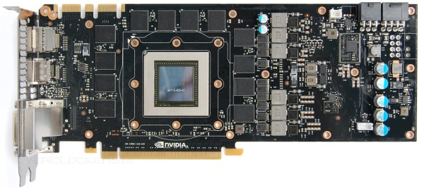 В углу присутствует два разъема питания — один на шесть контактов, второй на восемь. Присутствует и два разъема MIO для SLI. С обратной стороны вокруг чипа распаяно 12 микросхем памяти.