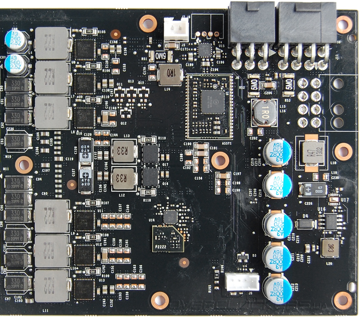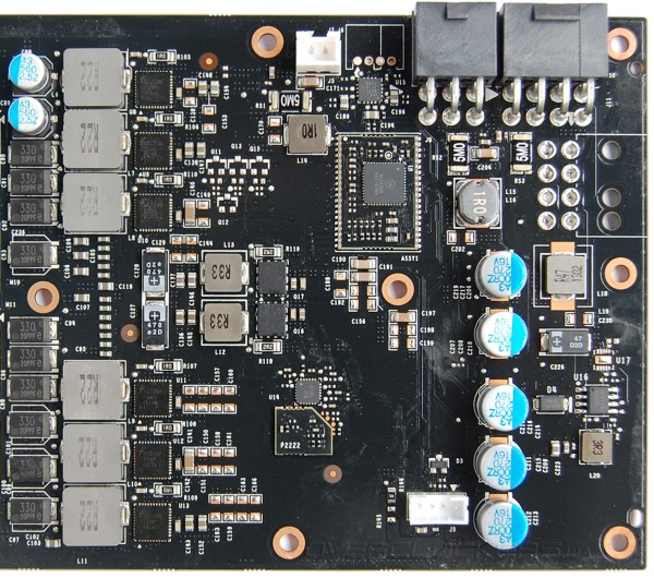 GPU запитан от шести фаз, реализованных на микросхемах DrMOS. Память GDDR5 запитана от двух фаз.