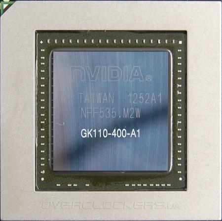 Крупный чип GK110-400-A1 не имеет крышки. Окружен массивной защитной рамкой.