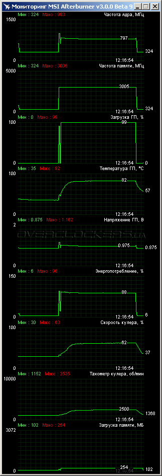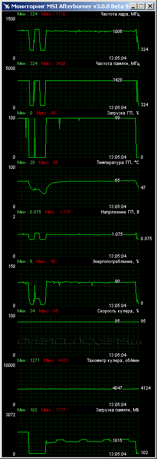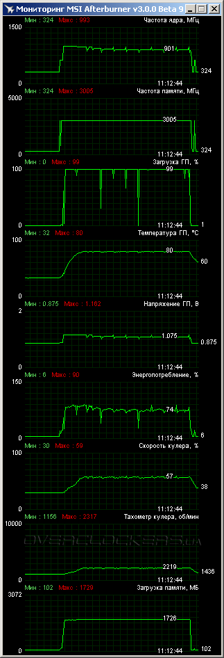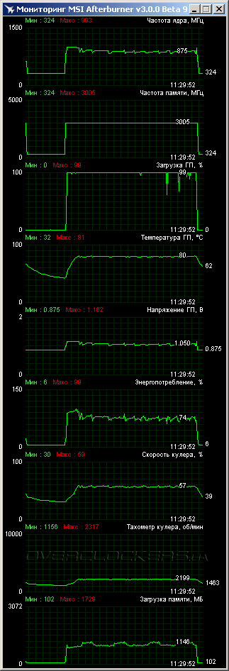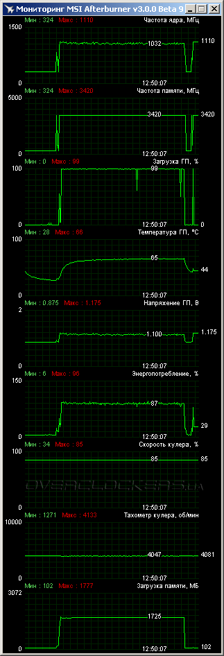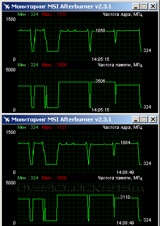 Пиковое значение частоты достигало 1110 МГц, в некоторых случаях было и 1124 МГц. Crysis: Warhead понижал частоту до 1032 МГц. Прибегли мы и к повышению напряжения. Хотя с нашими экспериментами реального прироста частоты от повышения напряжения мы не получили, но небольшой софтвольтмод явно улучшал стабильность при длительных нагрузках. Для нашей итоговой частотной конфигурации мы подняли питание ядра на 25 мВ при максимально доступных 38 мВ.