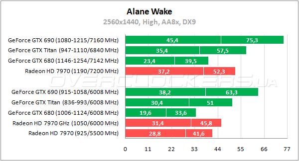 Игра Alan Wake оптимизирована под решения AMD. И Titan здесь не демонстрирует ничего феноменального на фоне Radeon HD 7970 GHz Edition, обгоняя этого конкурента лишь по среднему fps и только на 11%. Разница с GeForce GTX 680 составляет 52–55%. Первое место остается за GeForce GTX 690, который на 24–26% лучше GeForce GTX Titan.