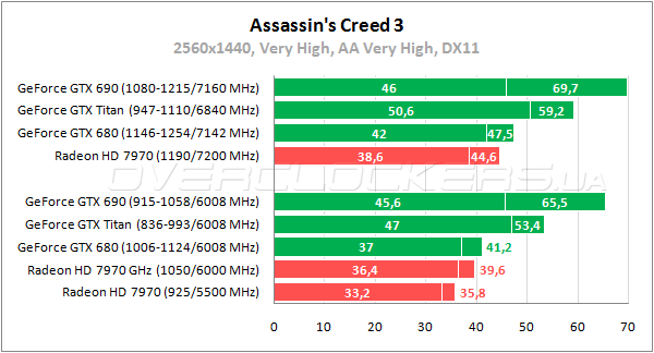 В Assassin’s Creed новичок на 27–30% производительнее GeForce GTX 680 и на 29–35% быстрее Radeon HD 7970 GHz Edition. Есть небольшое преимущество по минимальному fps над GeForce GTX 690. Хотя по среднеигровой частоте кадров двухчиповый видеоадаптер снова лидирует.