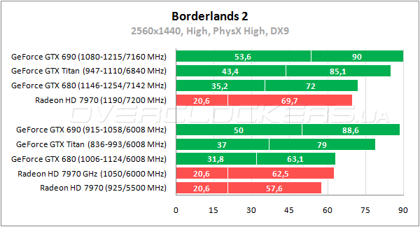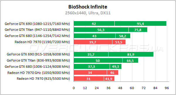 В BioShock при общем высоком уровне fps на GeForce GTX 690 наблюдаются редкие просадки производительности буквально до уровня одиночной видеокарты. В итоге GeForce GTX Titan демонстрирует самый высокий минимальный fps, обгоняя по этому параметру двухчипового гиганта на 40%. Разница с GeForce GTX 680 на уровне 35%. Radeon HD 7970 GHz Edition слабее на 45–47%. Разгон снова дает прирост в 13–14%.