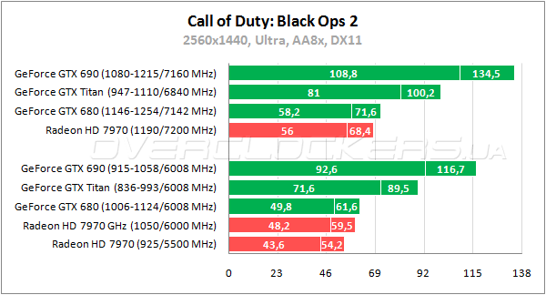 А вот в Black Ops 2 преимущество Titan над флагманом шестисотой серии весьма внушительное — на уровне 45%. Но GeForce GTX 690 снова впереди с отрывом в 30%. Разгон повышает результаты Titan на скромные 12–13%.