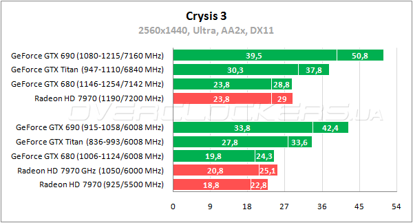 В Crysis 3 разница между однопроцессорными GeForce составляет 38–40%. Преимущество GeForce GTX 690 над GeForce GTX Titan достигает 20–25%. Разгон помогает ускорить Titan на 9–12%. Стоит отметить, что приемлемую производительность в игре обеспечивает только рассматриваемый видеоадаптер и двухчиповый GeForce. При этом разогнанный Titan позволит с комфортом играть даже при активном MSAA 2x в разрешении 2560x1440.