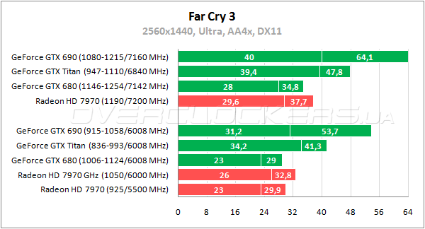 GeForce GTX 690 демонстрировал большой разброс минимального fps в Far Cry 3. И кроме периодически сильных просадок иногда начинали мерцать затененные поверхности. GeForce GTX Titan при меньшем среднем fps оказывается в итоге лучше двухчипового варианта по минимальному параметру. Преимущество над GeForce GTX 680 достигает 42–49%, выигрыш у Radeon HD 7970 GHz Edition составляет 26–32%. Разгон дает прирост для Titan в 15–16%.
