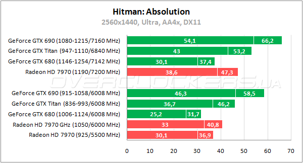 Последний Hitman явно симпатизируют решениям AMD. Поэтому тут преимущество новичка NVIDIA над Radeon HD 7970 GHz Edition не особо большое, на уровне 11–13%. Отставание от лидера, GeForce GTX 690, чуть менее 27%. Разгон ускоряет героя нашего обзора на 15–17%.