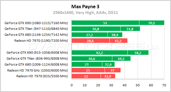 В Max Payne 3 преимущество над GeForce GTX 680 составляет 33–37%, отрыв от Radeon HD 7970 GHz Edition равен 20–22%. Отставание от лидера около 31–38%. Разгон в этот раз дает очень внушительный прирост 20% по минимальному fps и 16% по среднему параметру.