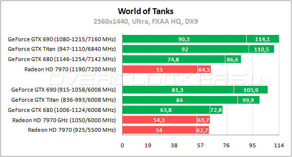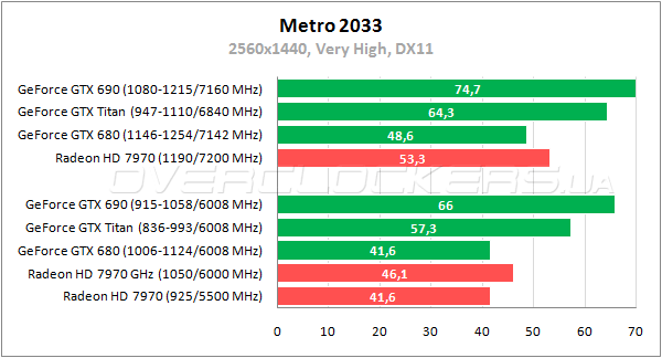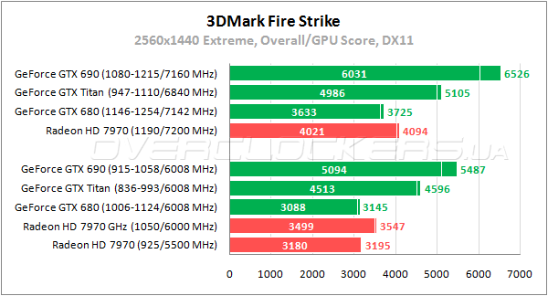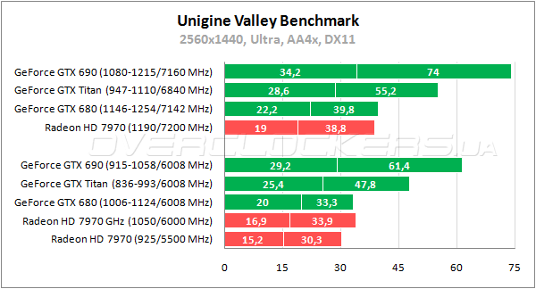 Преимущество 27–44% над GeForce GTX 680 и 41–50% над Radeon HD 7970 GHz Edition. Отставание от GeForce GTX 680 составляет 28% по среднему fps и более скромные 15% по минимальному fps. Прирост от разгона составляет 13–15%.