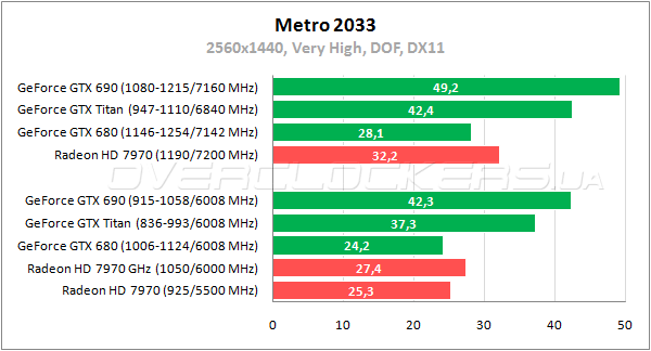 В более простом режиме Metro 2033 рассматриваемый видеоадаптер на 38% обходит GeForce GTX 680 и на 24% обгоняет старший Radeon. В более тяжелом режиме преимущество над GeForce GTX 680 доходит до 54%, с Radeon — до 36%. Отставание от GeForce GTX 680 уменьшается от 15% в простом режиме до 13% при активном Depth of Field. Прирост от разгона стандартный, на уровне 12–14%.
