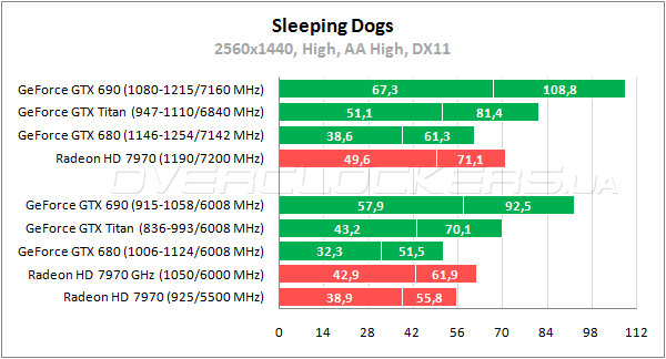 Еще одна оптимизированная под Radeon игра. В Sleeping Dogs новоиспеченный Titan демонстрирует преимущество над старшим Radeon лишь по среднему fps, и то не особо впечатляющее — от 10% до 13%. На позиции лидера уверенно стоит GeForce GTX 690 с отрывом в 32–34% относительно нашего героя. Разгон снова дает весьма хороший прирост от 16% до 20%.