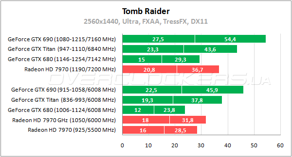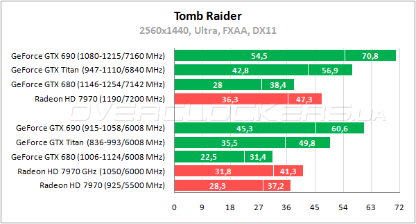GeForce GTX Titan в Tomb Raider уверенно демонстрирует комфортный уровень fps, что совершенно не по плечу GeForce GTX 680. Разница между ними 58–59%. Преимущество над старшим Radeon 12–21%. Отставание от лидера — 22–28%.
