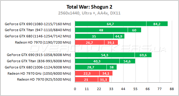 Преимущество Titan над GeForce GTX 680 в Warhead доходит до 39–49%. Radeon HD 7970 GHz Edition слабее на 25–38%. Отставание от GeForce GTX 690 составляет 33%. Разгон в данном случае повышает производительность Titan на 16–17%.