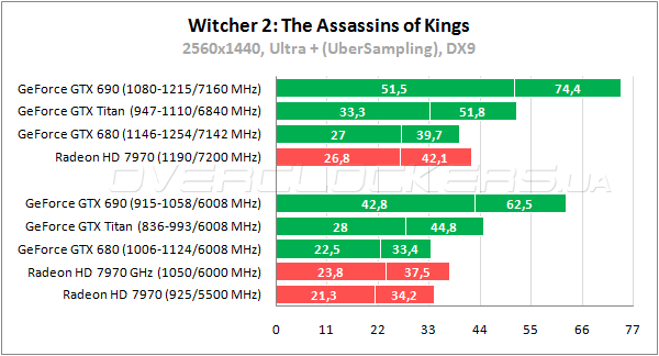 Во втором «Ведьмаке» Titan доводит свое преимущество над собратом до 24–34% и выигрывает 18–23% у Radeon HD 7970 GHz Edition. Наконец-то можно комфортно играть при «запредельном качестве» в 1920x1080. Впрочем, GeForce GTX 690 с этой задачей справляется еще лучше. Отрыв лидера от Titan огромный — от 40% до 53%.