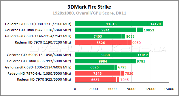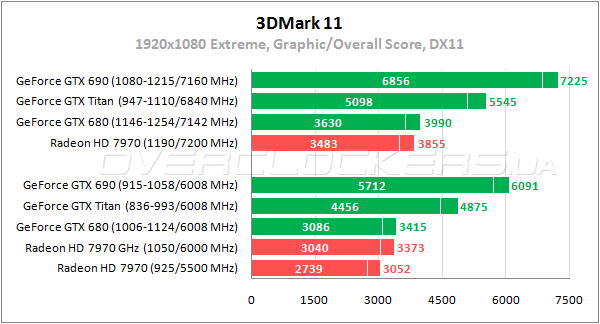 В более новом 3DMark положение представителей NVIDIA не так отлично. Новичок в этот раз обходит Radeon HD 7970 GHz Edition лишь на 24% в меньшем разрешении и на 29% в максимальном. Разница 42–46% с GeForce GTX 680. Отставание 10–13% от GeForce GTX 690. Так что разогнанный Titan максимально близко приближается в лидеру тестирования при повышении своих частот.