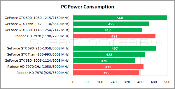 Вполне ожидаемо уровень потребляемой мощности у Titan выше чем у одночиповых соперников. Но при этом приятно отметить небольшую разницу с Radeon HD 7970 GHz Edition на фоне весьма значительной разницы в производительности.