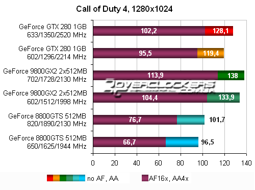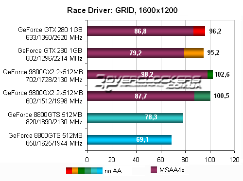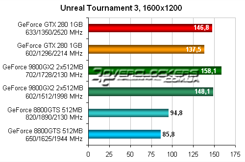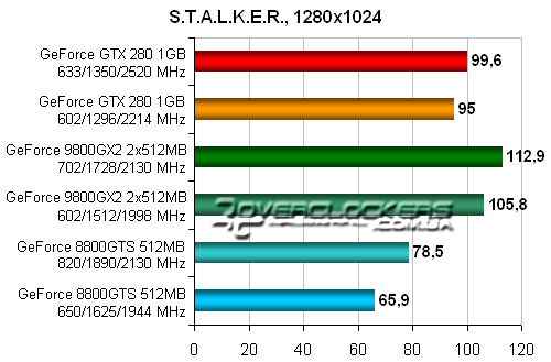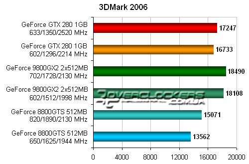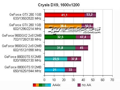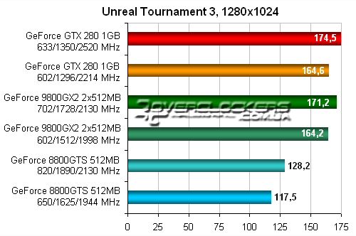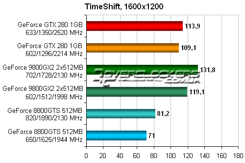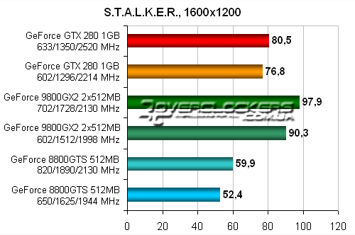 В этом синтетическом тесте лидирует GeForce 9800 GX2. Она на 33% процента быстрее GeForce 8800 GTS и на 8% быстрее GeForce GTX 280 на номинальных частотах.