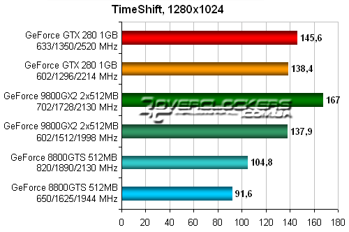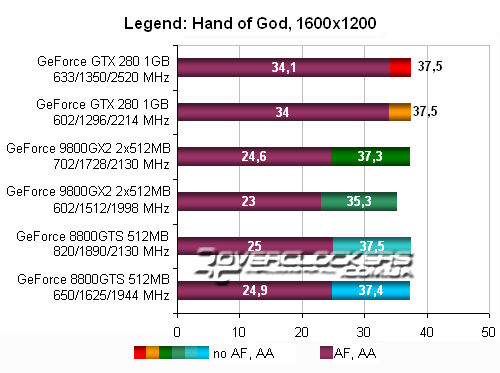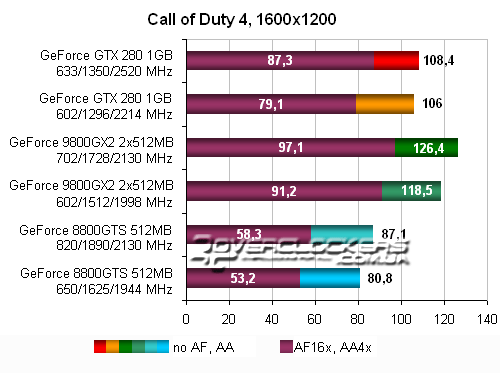 Говорить об однозначной победе GeForce GTX 280 в этой игре нельзя. Производительность всех видеокарт без активации сглаживания примерно на одном уровне. Кстати, эта игра явно безразлична к SLI. GeForce 8800GTS умудряется даже слегка обогнать GeForce 9800GX2. А вот активация фильтрации и сглаживания сразу выводит на первое место новичка. Видно, что у GT200 все же есть порох в пороховницах.