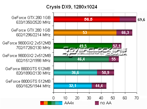 Паритет в низком разрешении и небольшое, но все же преимущество GeForce 9800 GX2 в высоком разрешении.