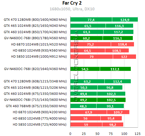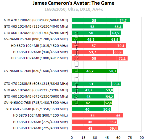В простом режиме GV-N460OC-768I идет наравне с GeForce GTX 460 1GB, но при активации сглаживания сказывается узкая шина памяти и Gigabyte до старшего брата уже не дотягивает. При разгоне до 820/1640/4360 МГц видеокарта нагоняет по средней частоте кадров GeForce GTX 470 и Radeon HD 6870, но уступает им по минимальному fps. Полностью обойти их удается при максимальном разгоне.