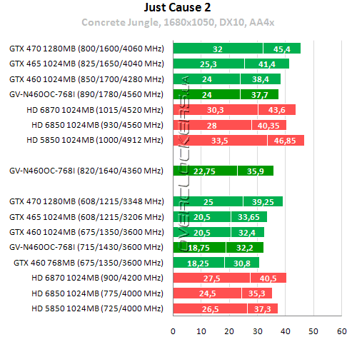 В DirectX 11 все GeForce GTX 460 не справляются с разрешением 1680x1050 на максимальных настройках качества. С максимальным разгоном Gigabyte GV-N460OC-768I не дотягивает чуть-чуть до уровня Radeon HD 5850 на стандартных частотах.