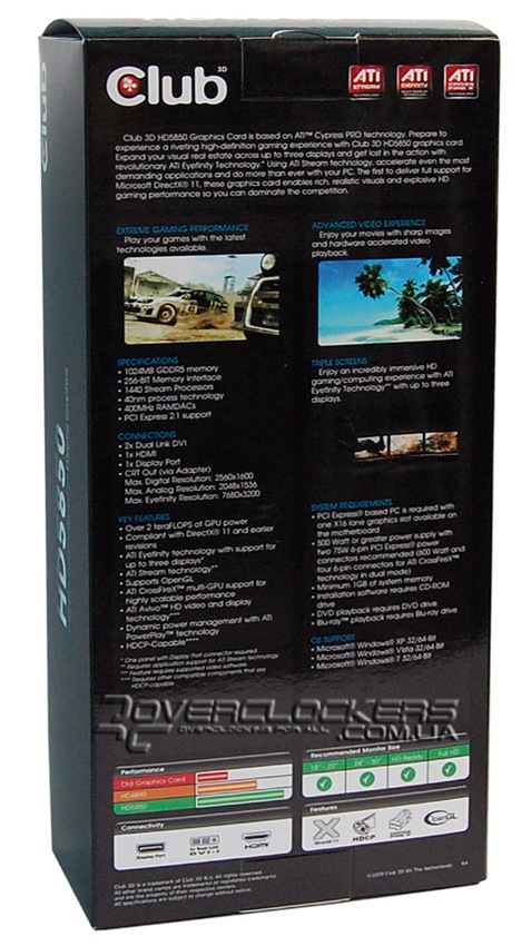 Внутри кроме самого адаптера имеется лишь диск с драйверами и талон с кодом для бесплатного скачивания игры Colin McRae: DiRT 2 из Steam. Никаких переходников и кабелей в комплекте нет, но они и не нужны, ведь на заднюю панель вынесены разъемы четырех типов: два DVI, один HDMI и DP (Display Port).