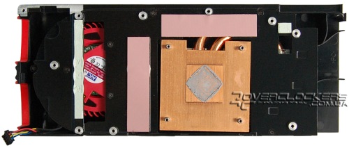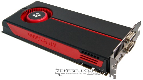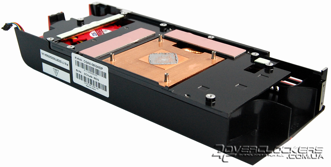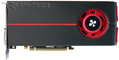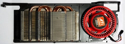 Черный кожух системы охлаждения имеет красные вставки, сбоку нанесен логотип ATI Radeon. Смотрится просто, но симпатично.