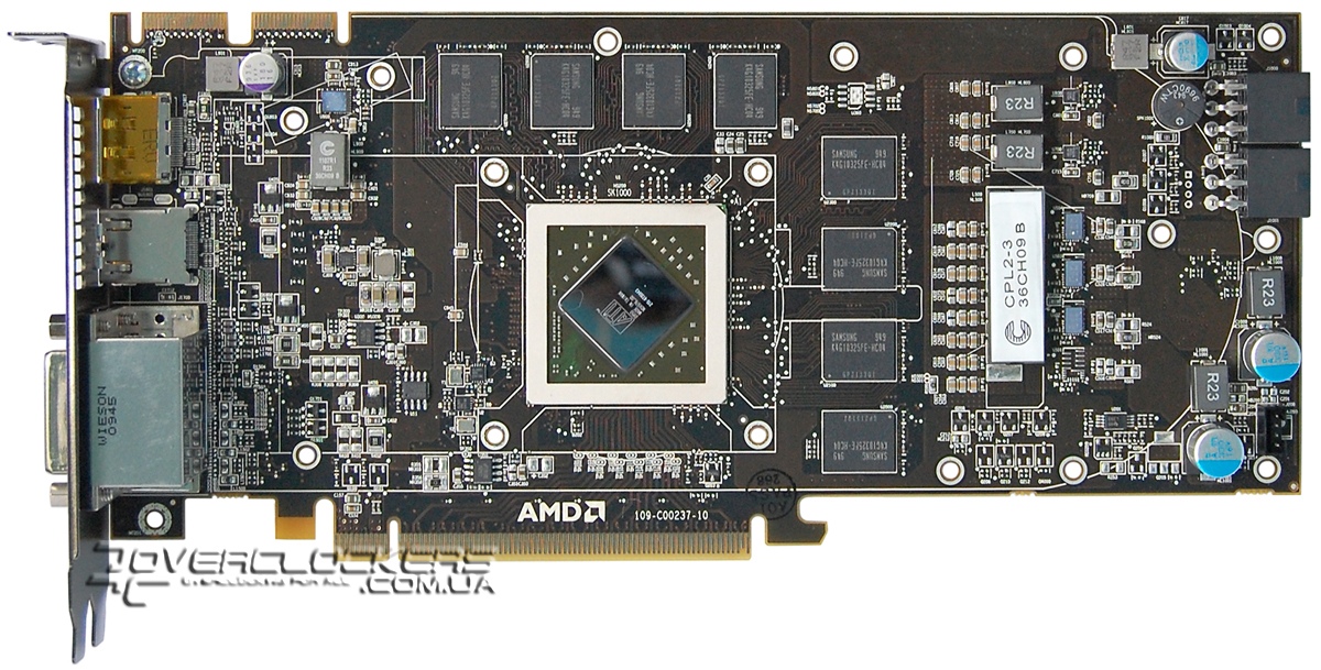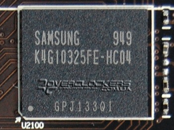 Один гигабайт видеопамяти набран восемью микросхемами GDDR5 Samsung K4G10325FE-HC04 (такие же используются у GeForce GTX 470).