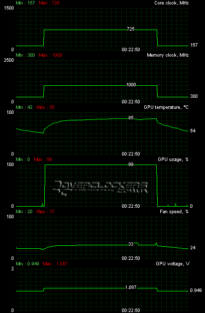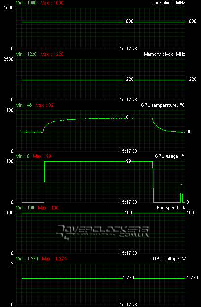 Для повышения стабильности обороты вентилятора были зафиксированы на максимуме, и ядро при этом не прогревалось выше 82 °С даже в тесте Fur Rendering Benchmark. Режим абсолютно не комфортный для повседневного использования, при 100% гул турбины у Radeon значительно громче шума систем охлаждения GeForce в таком же режиме. Если использовать более низкие частоты и напряжение GPU, то можно обойтись и автоматическим режимом регулирования оборотов, при этом уровень шума в 3D-приложениях останется на приемлемом уровне. В частности, наш экземпляр стабильно работал при номинальном напряжении на частоте ядра вплоть до 840 МГц, что совсем незначительно сказывалось на температурном режиме и кулер, работая в штатном режиме, поддерживал приемлемые температуры при стандартных оборотах, и, соответственно, минимальном шуме.