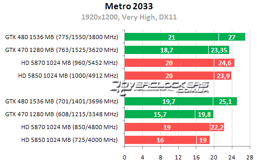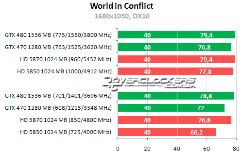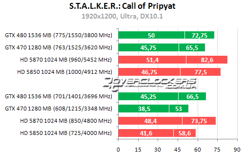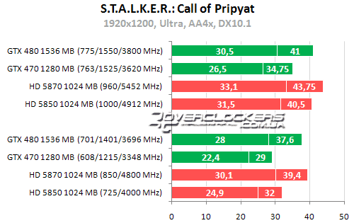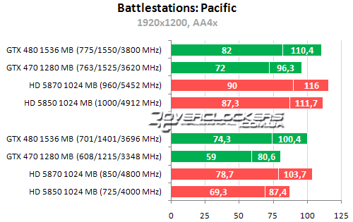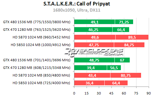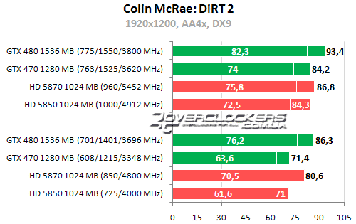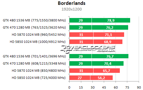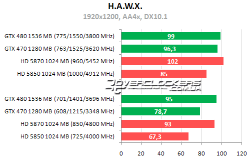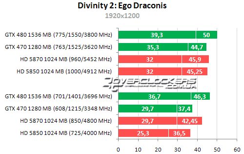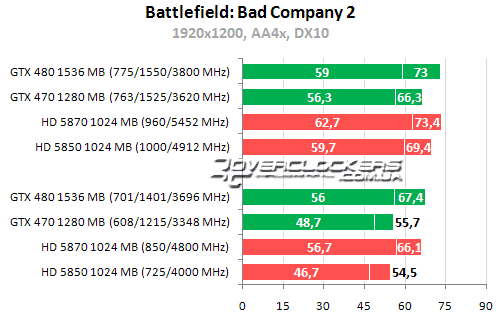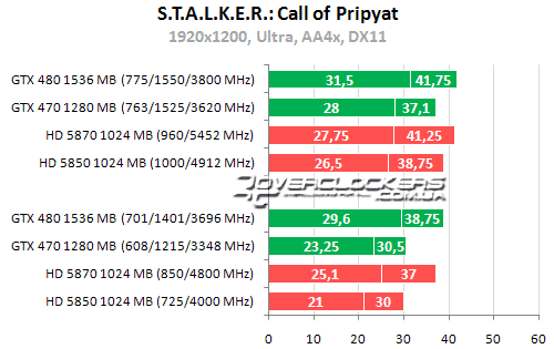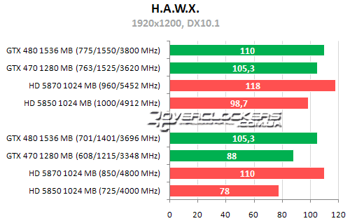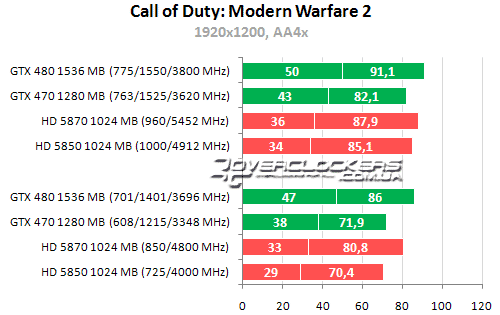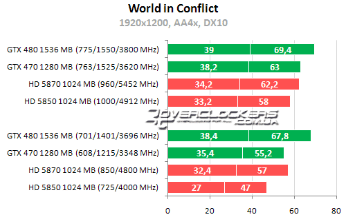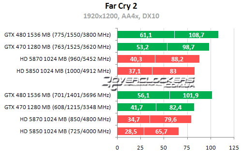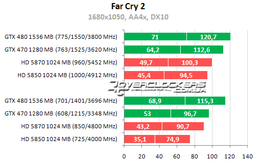 Разница между Radeon HD 5850 и Radeon HD 5870 не более 15%, а младший GeForce уступает старшему GeForce GTX 480 до 23% по минимальной частоте кадров. В простых режимах GeForce GTX 470 является аутсайдером, но при включении сглаживания обходит Radeon HD 5850, а по минимальному показателю и Radeon HD 5870. Если в разгоне младший Radeon почти не уступает старшему брату, то повышенные частоты не помогают GeForce GTX 470 достигнуть уровня GeForce GTX 480.