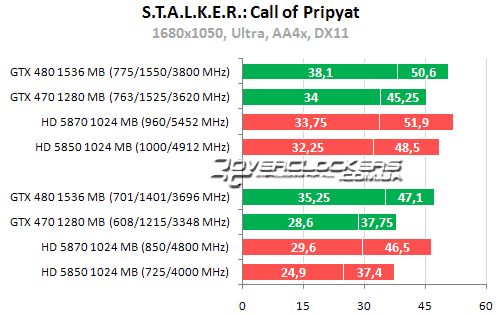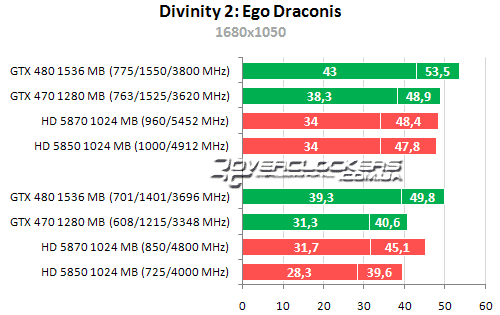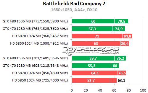 В данной игре GeForce GTX 470 и Radeon HD 5850 идут примерно наравне, хотя надо отметить весьма заметное преимущество по минимальной частоте кадров представителя AMD в разрешении 1680x1050 и чуть более высокие показатели у соперника NVIDIA в режимах со сглаживанием. С разгоном же Radeon HD 5850 снова отодвигает GeForce GTX 470 на последнее место во всех режимах, умудряясь даже обойти разогнанный GeForce GTX 480 в более низком разрешении и совсем незначительно уступать адаптеру Radeon HD 5870, работающему на частотах 960/5452 МГц.