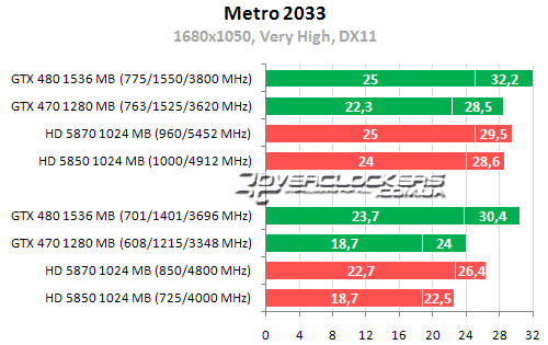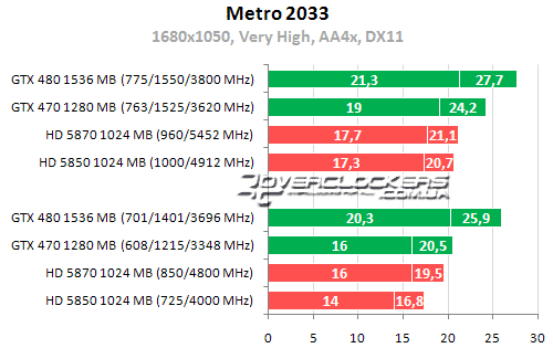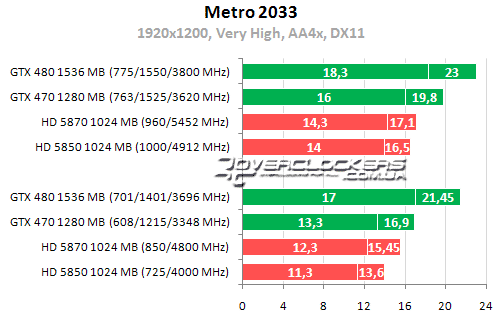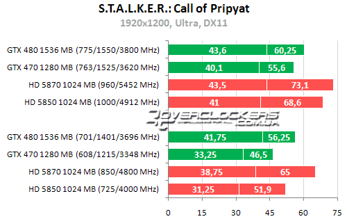 К сожалению, из-за дефицита времени мы успели протестировать GeForce GTX 480 только лишь под DirectX 11, поэтому на диаграммах результатов под DirectX 10 этого видеоадаптера не присутствует.