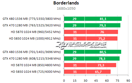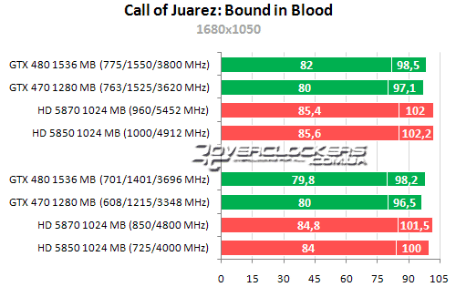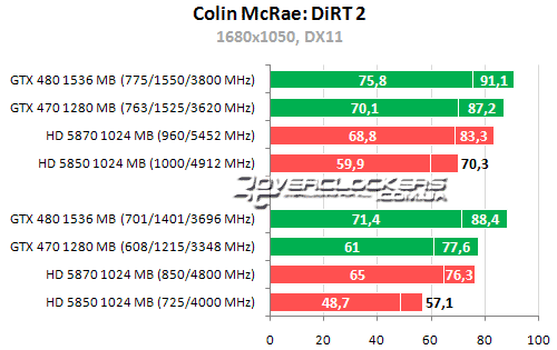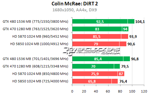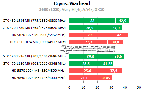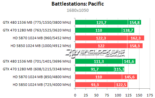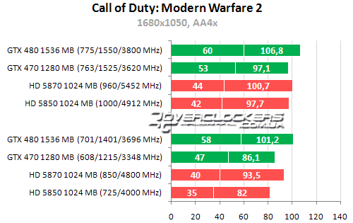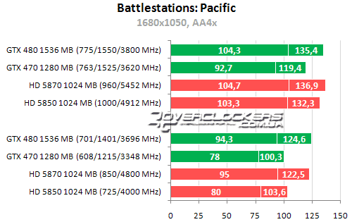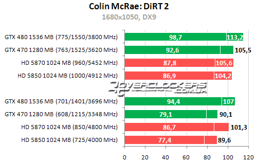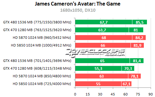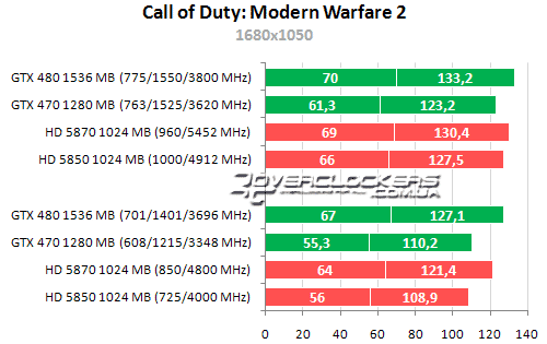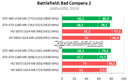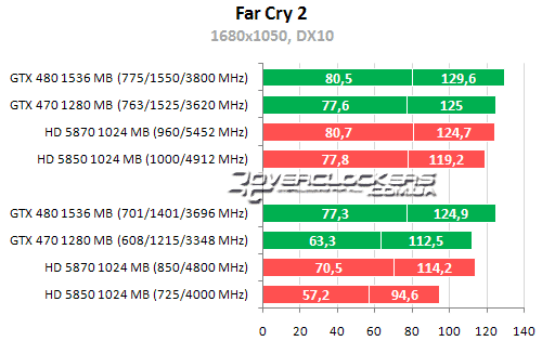 В разрешении 1280x1024 Radeon HD 5850 оказывается быстрее GeForce GTX 470, но уже в 1680x1050 крошечное преимущество у карты NVIDIA (лишь 1,3 %).